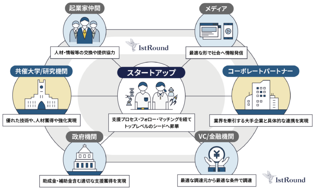「1stRound」は、大学に関連する優れた技術や着想の事業化、社会実装を支援する国内最大のアカデミア横断型インキュベーションプラットフォームです。初動を加速させるためのNon-Equity資金支援をはじめ、その事業価値が算定可能な事業体・スタートアップとなるためのハンズオン支援を行うべく、2017年より東京大学を母体に「起業支援プログラム」としてスタートしました。2019年より名称を「1stRound」とし、コーポレートパートナーの参画も得たコンソーシアム形式で展開、その後国公立・私立大学、国立研究機関が参画し、国内最大規模を誇るアカデミア共催プログラムへと進化しています。